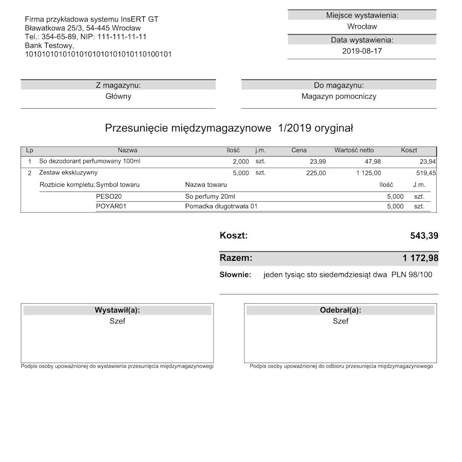 Dla klientów, którzy chcą ułatwić pracę sobie z kompletami, proponujemy wzorzec graficzny przesunięcia międzymagazynowego MM z rozbiciem kompletów na składniki je tworzące. Dzięki temu ułatwiona jest poprawna identyfikacja kompletów i składników je tworzących.